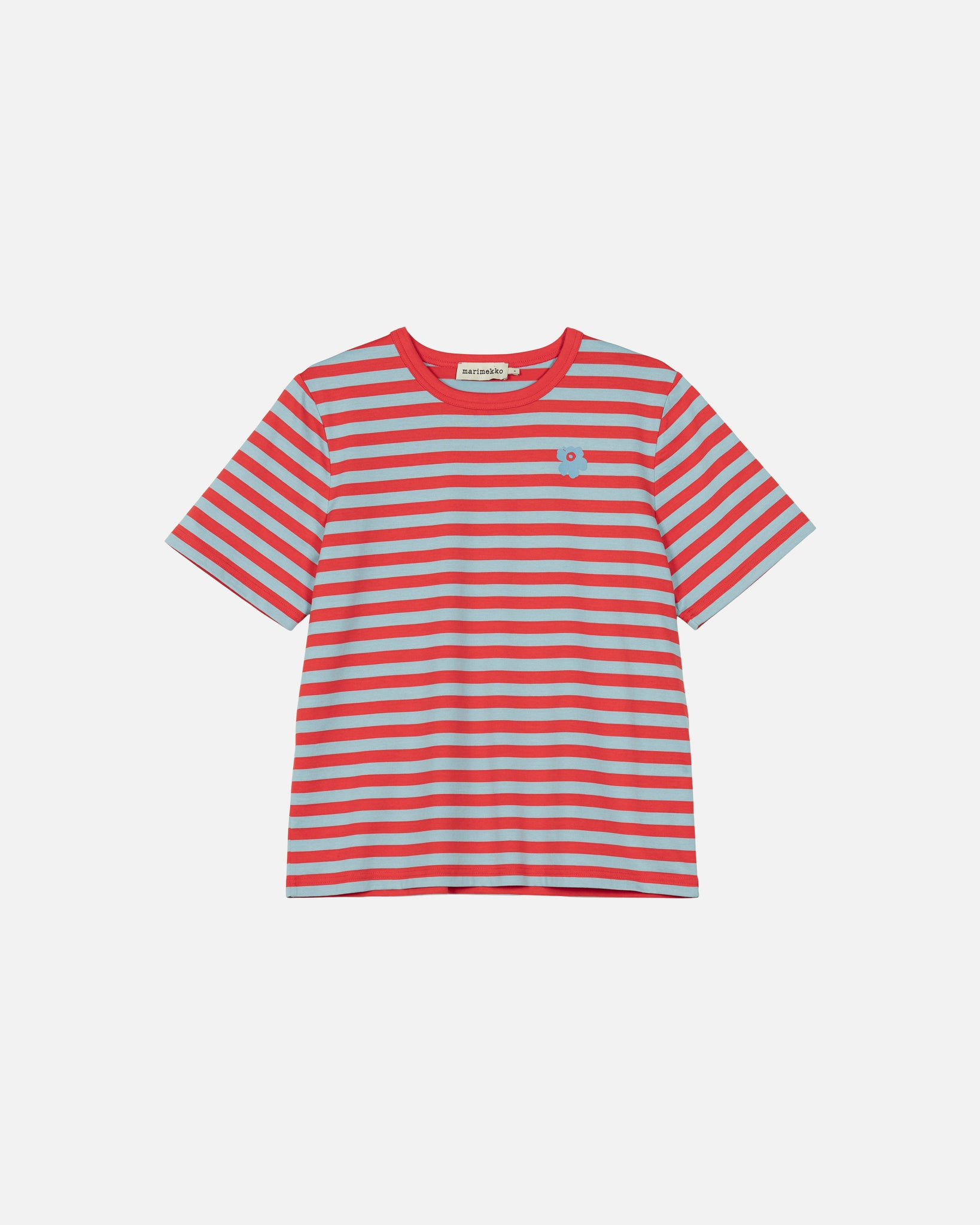 Streifen-Shirt von Marimekko - gerader, entspannter Schnitt, langer Arm und natürlich: gleichmäßige Streifen (finnisch: Tasaraita). Neu ist die Unikko Blüte auf der Brust. Fällt sehr groß aus, daher unbedingt eine Nummer kleiner bestellen ... und es wird immer noch entspannt sitzen.