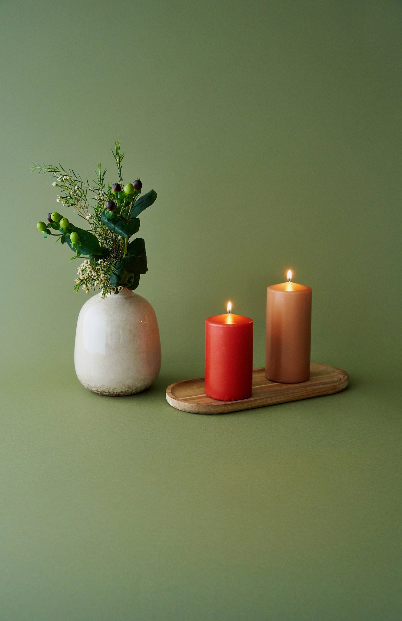 Formschöne Blockkerze mit langer Brenndauer in einem matten Rotton.