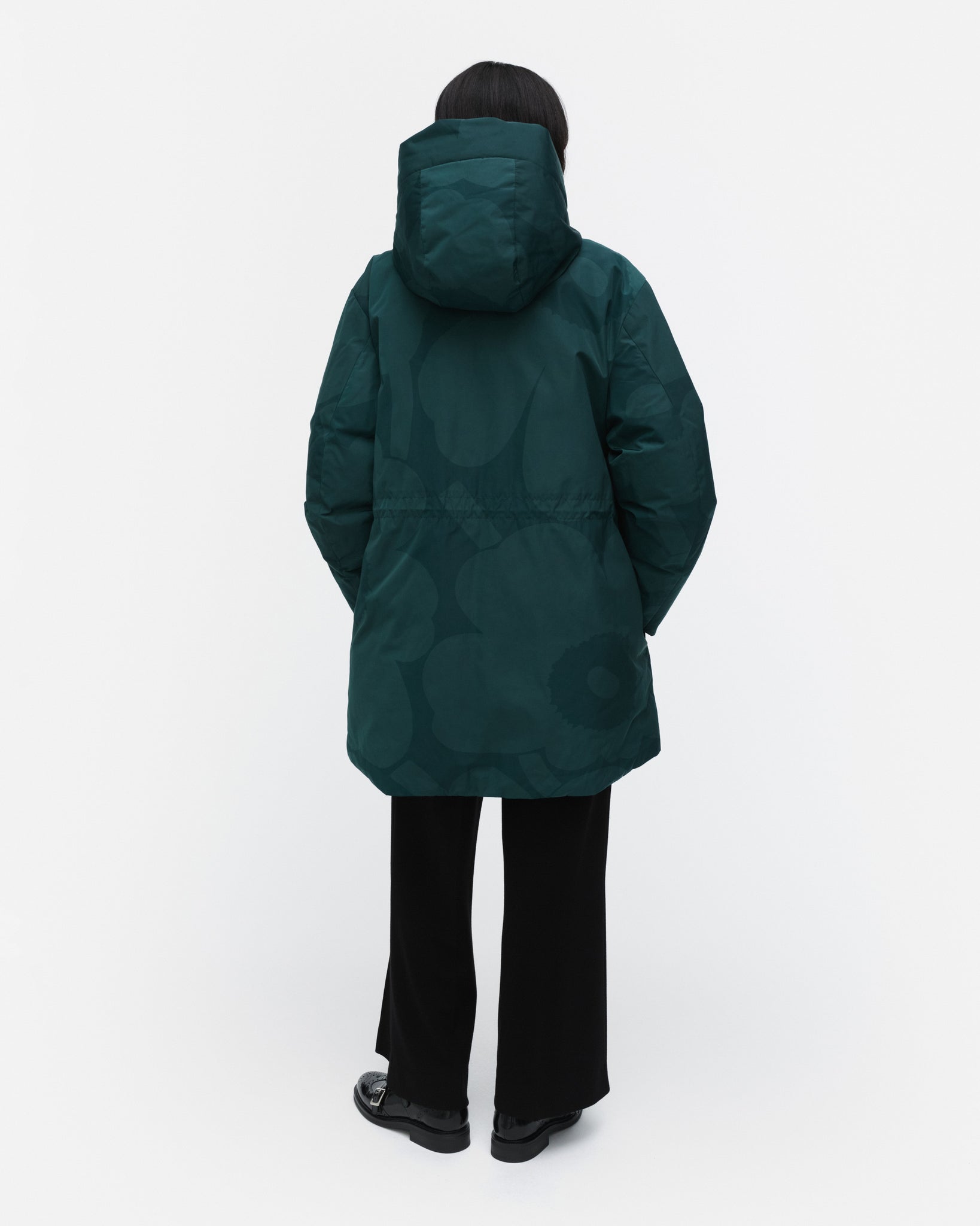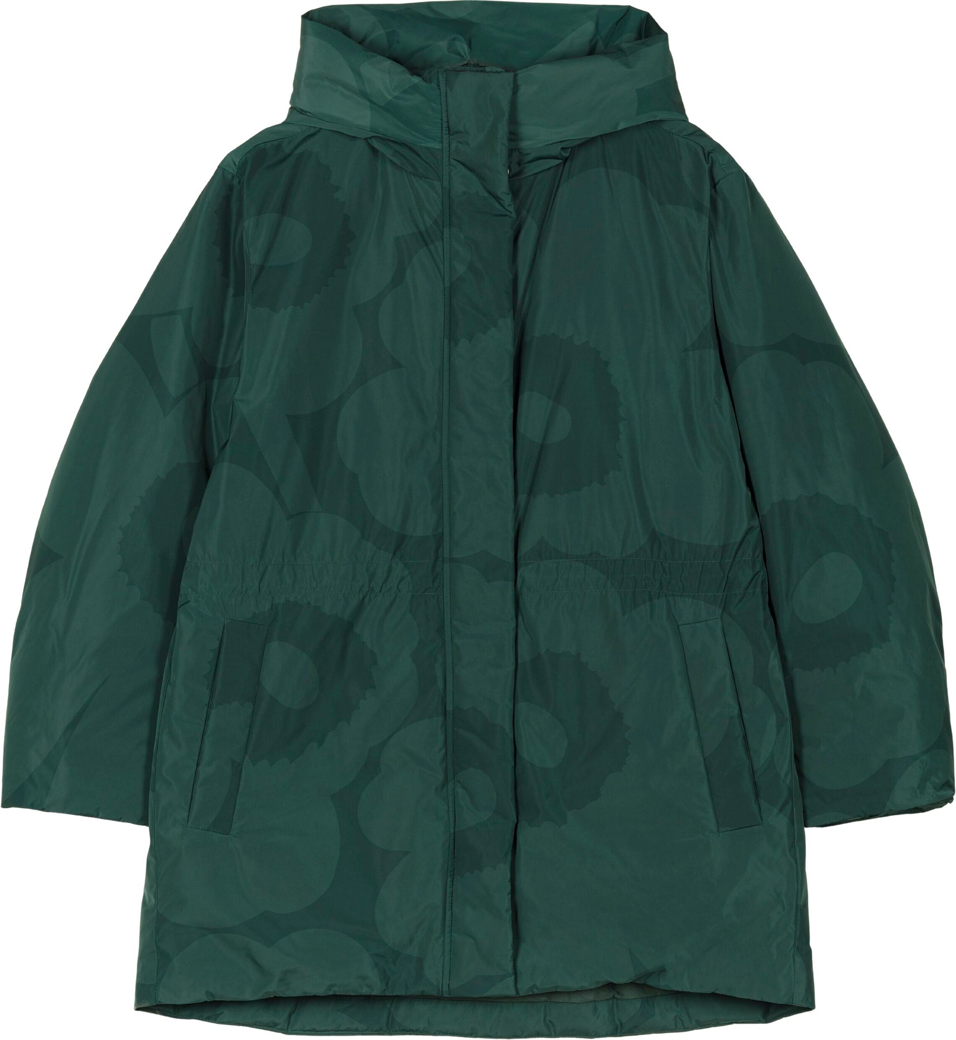Gerade geschnittener Mantel mit den unverwechselbaren Marimekko Blüten. Verschließbar mit Reißverschluss Druckknöpfen. Hat zwei seitlich angelassene Taschen, einen Stehkragen mit großer Kapuze sowie eine Innentasche mit Reißverschluss. Kann an der Taille verstellt werden.