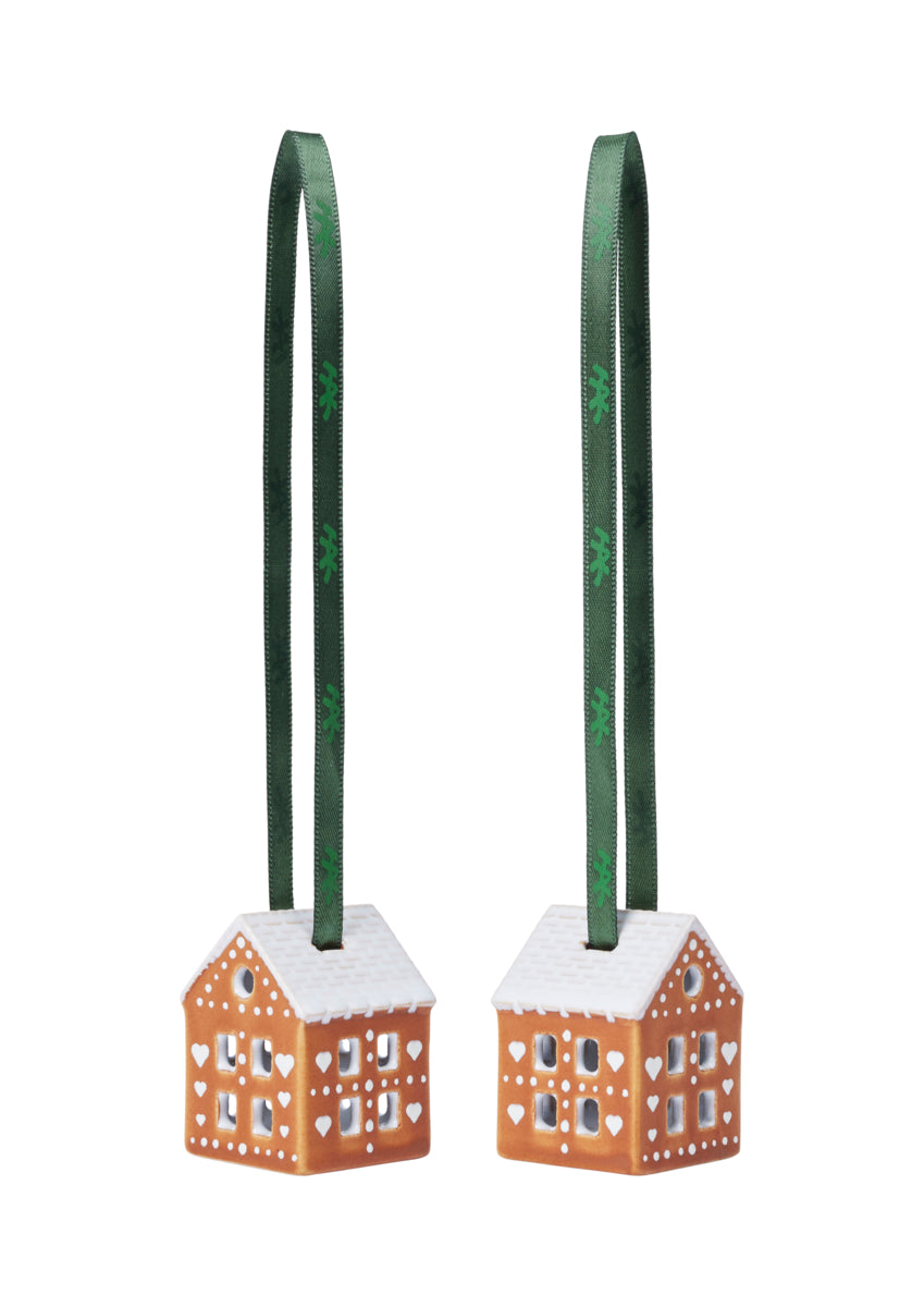 Ein geschmackvolle Weihnachtsklassiker aus handgefertigter Keramik, geformt durch Tradition. Backen gehört zur Weihnachtszeit, und mit seinem lebensechten Ausdruck kann man sich leicht vorstellen, dass Kähler gerade ein frisch gebranntes Lebkuchenhaus aus dem Keramikofen geholt hat. Man kann den Lebkuchen fast riechen, aber lassen Sie sich nicht täuschen – die gesamte Gingerbread-Serie besteht aus Steinzeug, und die weiße Glasur ist keramisch. Die kleinen Kähler Gingerbread Weihnachts-Hängeschmuck sind mit filigranen Mustern verziert, die die süßesten kleinen Herzen und schneebedeckte Dächer zeigen, genau wie bei einem traditionellen Lebkuchenhaus. Lassen Sie sie an Zweigen, im Fenster oder am Weihnachtsbaum hängen und genießen Sie sie den ganzen Dezember über zusammen mit dem Rest der Serie. Oben an den Gingerbread-Anhängern befinden sich zwei kleine Löcher, durch die elegante Bänder in Kählers charakteristischem Grün gefädelt sind.
