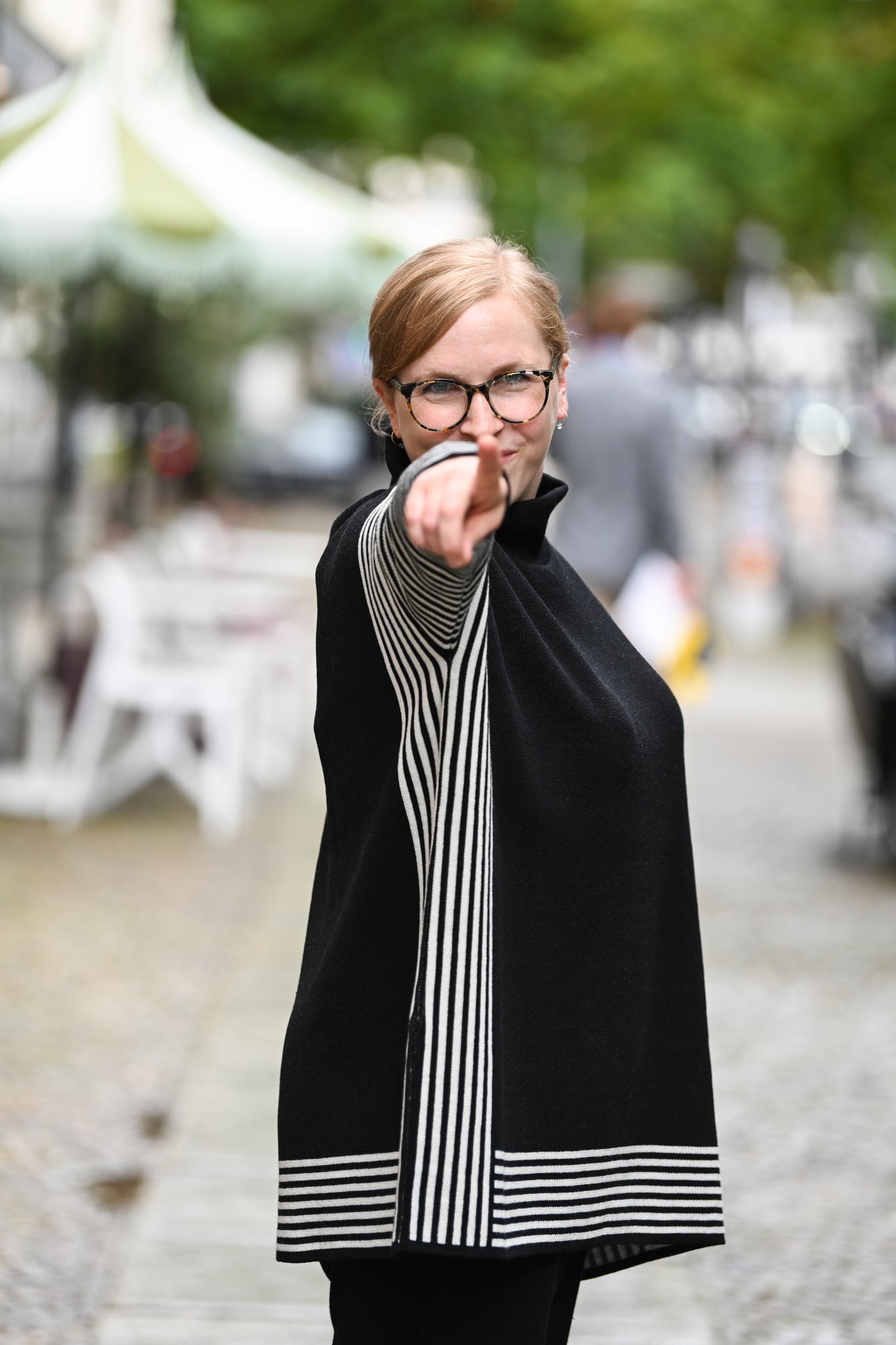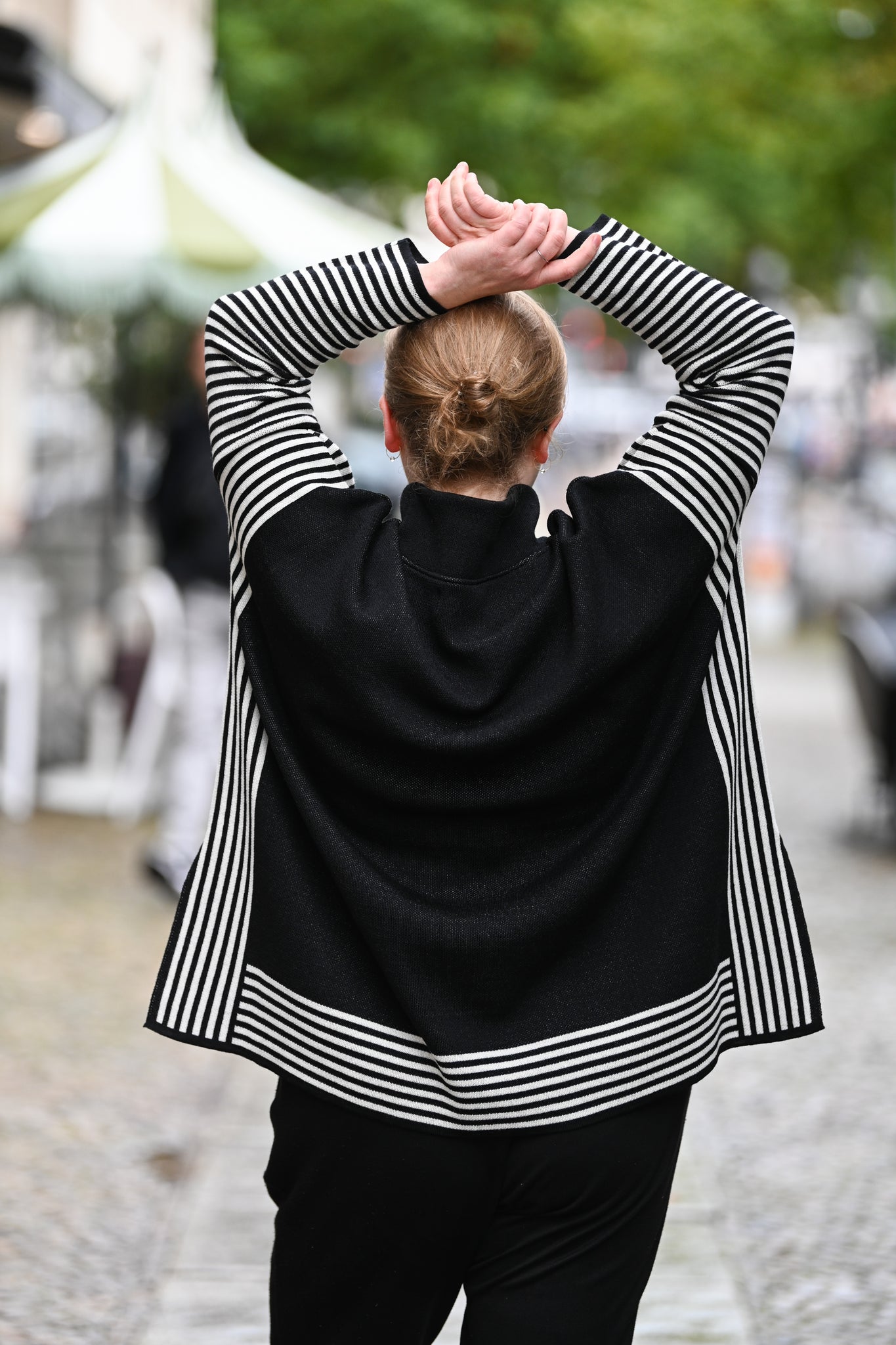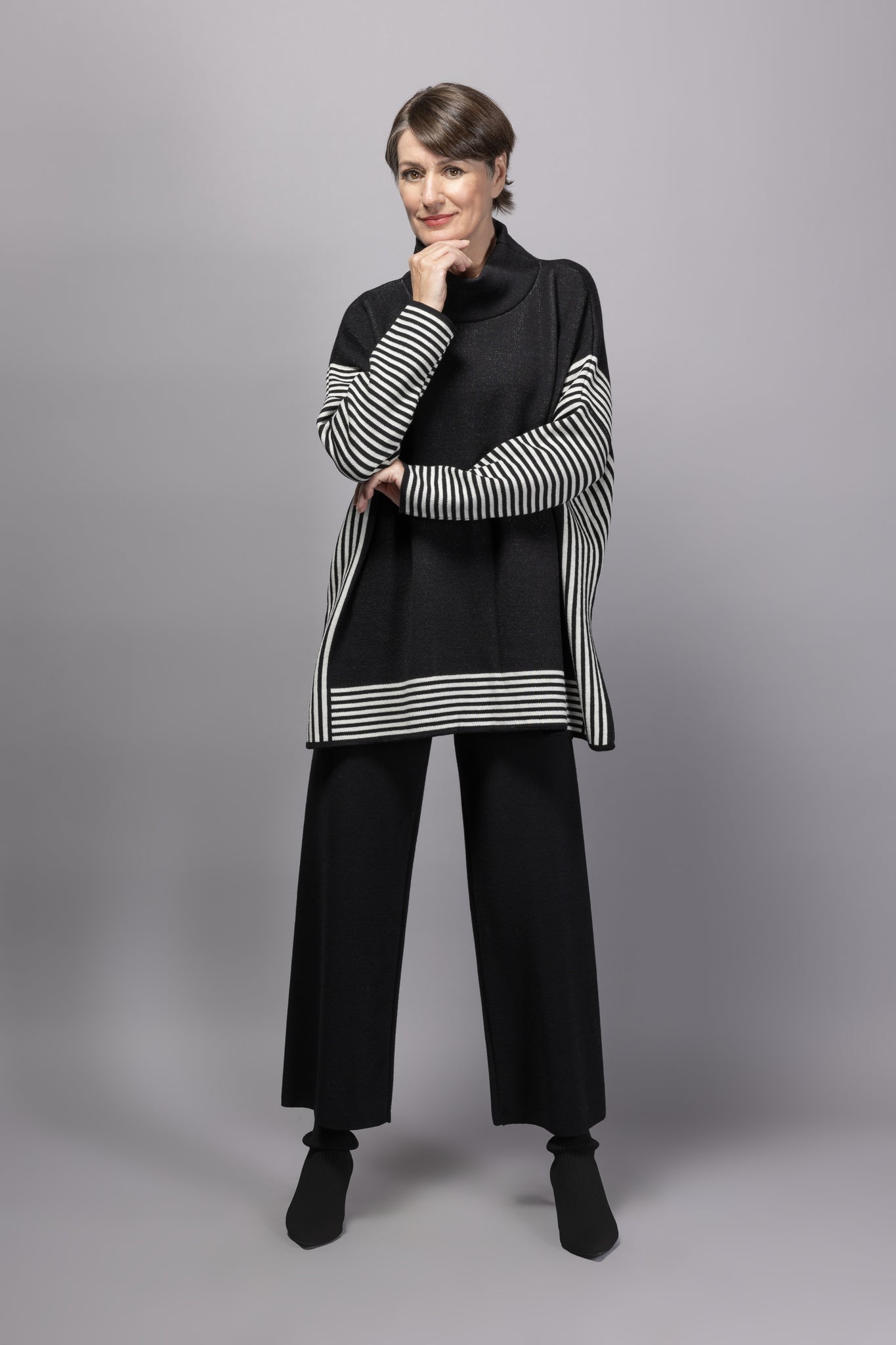 Graphisch gestalteter Pullover aus reiner Merinowolle. Sehr weit geschnitten, angenehmer kurzer Stehkragen, seitlich geschlitzt. Schlichtweg ein Lieblings-Pullover.