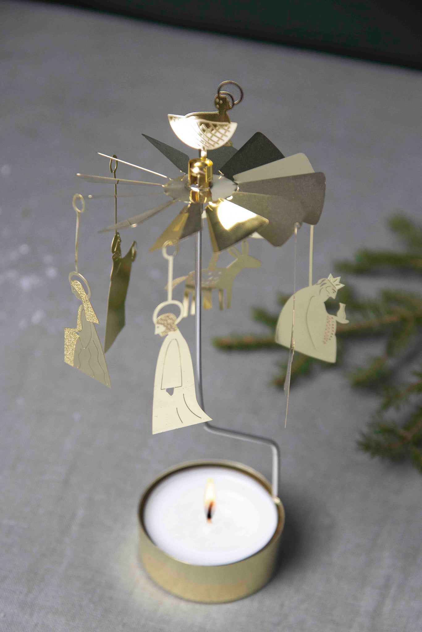 Diese stimmungsvollen Karusselle drehen sich durch die aufsteigende warme Luft des Teelichts. Die Flügel sind bei der großen Variante graviert. Zum Selbstmontieren (ganz einfach), inkl. Teelicht.