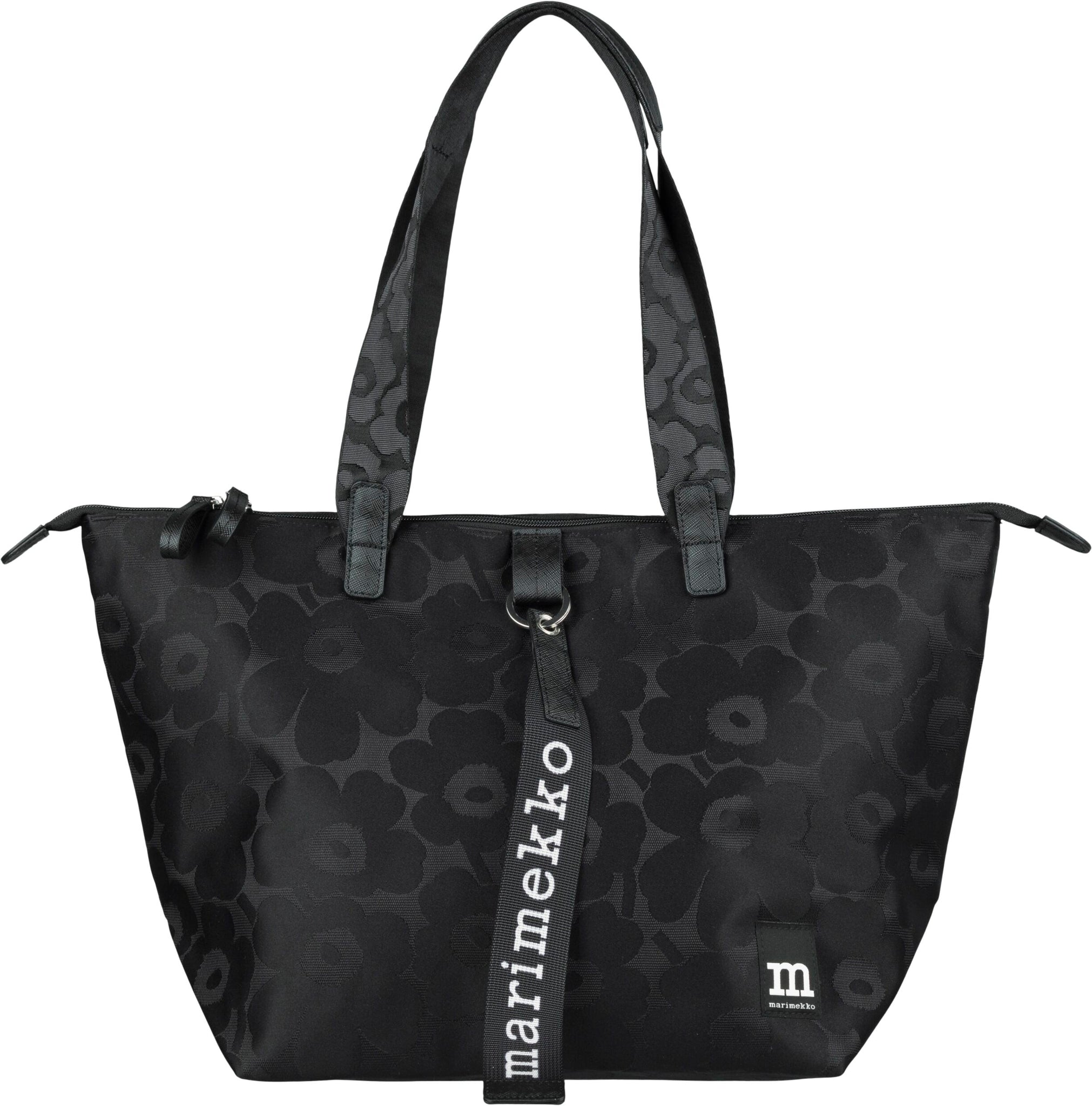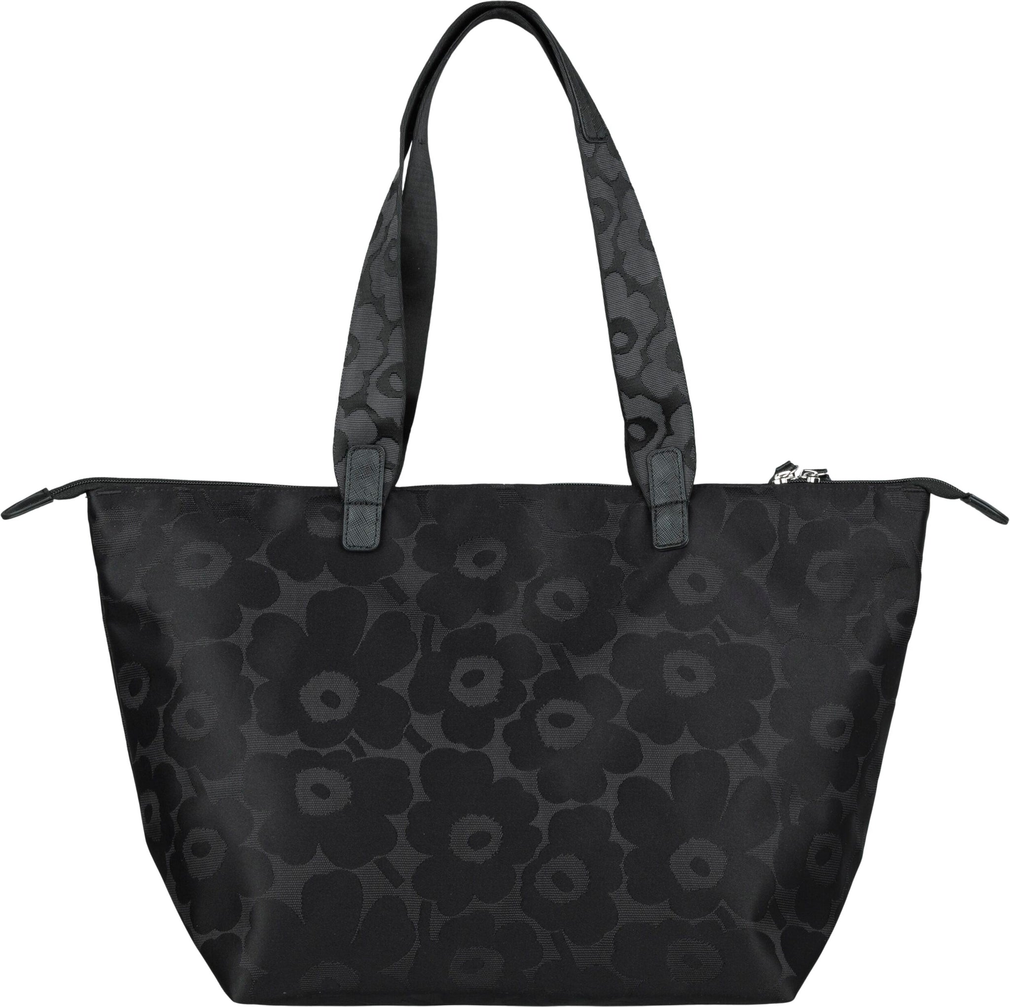 Schultertasche mit Unikko Blüten bedruckten Tragriemen, einer Innentaschen und Stauraum groß genug für ein Laptop. Perfekt für all die Habseligkeiten, die man immer dabei hat. Die typischen Marimekko Blüten verteilen sich in Schwarz auf Schwarz auf der gesamten Tasche.