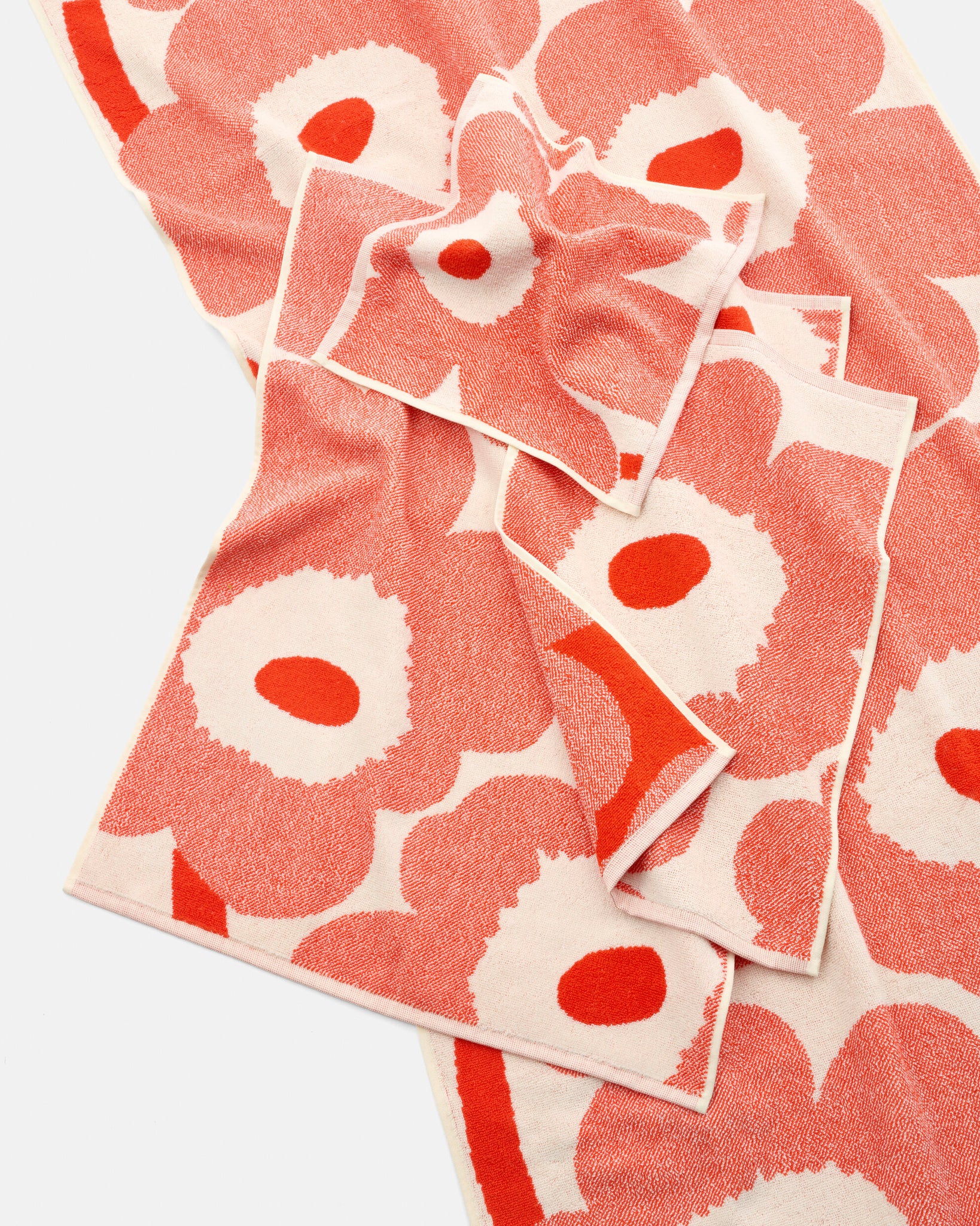 Der Marimekko Handtuch Klassiker in kräftigen, kontrastierenden Farben. Vorder- und Rückseite jeweils im Negativ bedruckt
