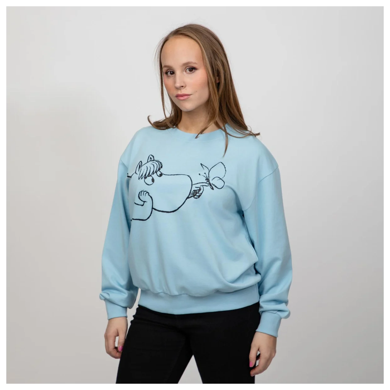 Lässiges, weiches Sweatshirt mit dem Moominfräulein in einem schönen Hellblau.