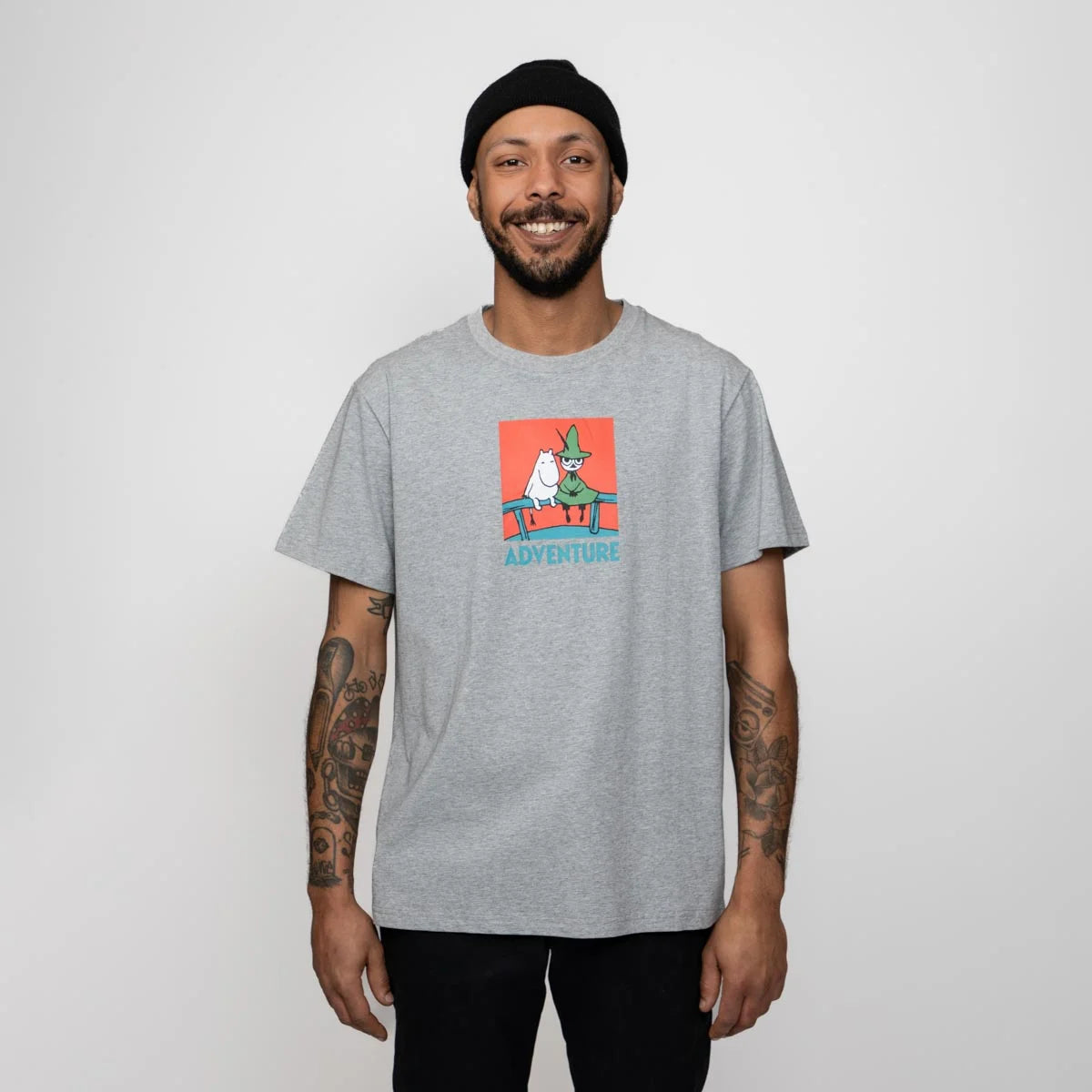 Entspannt geschnittenes Shirt mit Moomin- und Snufkin-Print. Für Frauen und Männer passend.
