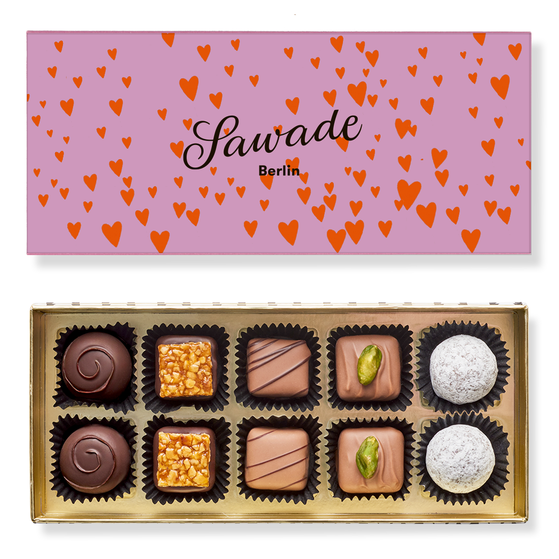 nhalt: 2x Marzipan-Krokant in Zartbitterschokolade, 2x Pistazien-Nougat in Vollmilchschokolade, 2x Marc de Champagne Trüffel in Vollmilchschokolade, 2x Bitter-Sahne-Trüffel in Zartbitterschokolade, 2x Blätterkrokant in Vollmilchschokolade