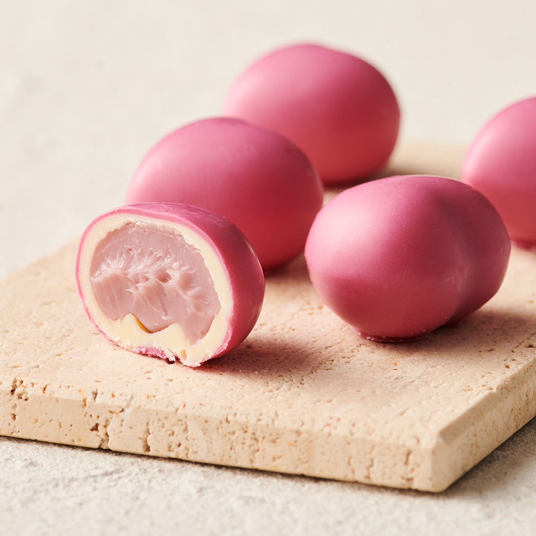 Pralinenmischung mit 74% weißer Schokolade (Himbeer-Trüffelherz gefärbt mit Rote Bete)